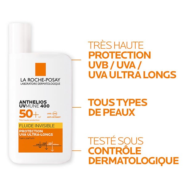 Découvrez le Fluide Invisible Anthelios UVMune 400 SPF 50+ de La Roche-Posay, un soin solaire ultra-léger offrant une très haute protection contre les UVB, UVA et UVA ultra-longs. Sa texture fluide pénètre rapidement sans laisser de traces blanches ni de fini gras.